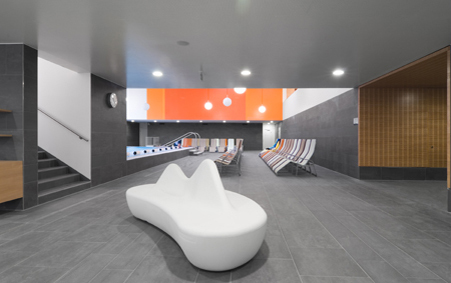 Der bestehende Saunabereich für Damen und Herren wird im 1.Obergeschoß in die neuen Bereiche integriert, die Aufenthaltsbereiche vergrößert und die Oberflächen teilweise erneuert und an die neue Gestaltung angeglichen.