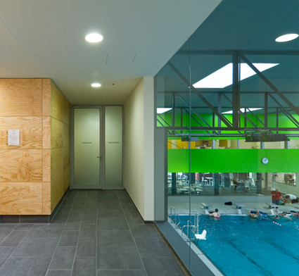 Im linken eingeschoßigen Teil der Eingangshalle erfolgt der Zugang zum Freibad und zur Tiefgarage sowie über eine Treppe zu den Personalräumen im OG. Nach rechts führt die bestehende Treppe in den Saunabereich. Ebenerdig gelangt man durch den neuen Garderobentrakt über den Nassbereich zur Schwimmhalle und im nördlichen Teil der Halle über eine Schallschleuse zum Wellnessbereich. An dieser Schnittstelle zwischen Haupthalle, Sprungturm und Wellnessbereich befindet sich die Bademeisterkabine mit dem Erste-Hilfe Raum.