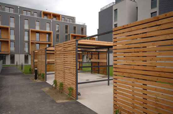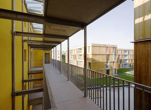 Als Alternative zur monotonen, zeilenartigen 1960er Jahre-Bebauung der unmittelbaren Nachbarschaft haben Hermann und Johannes Kaufmann einen viergeschossigen Siedlungstypus entwickelt, der differenzierte Außenraumqualitäten bietet. Die drei an die Grundgrenzen gerückten Baukörper definieren einen durchlässigen Hof, das Marchfeld wird nicht - so Johannes Kaufmann - „wagenburgartig ausgegrenzt, sondern fließt durch die Siedlung, was auch durch das Grünkonzept verstärkt wird.“ Die Erschließung der einzelnen Baukörper ist ebenfalls abwechslungsreich konfiguriert, da die südorientierten Wohnungen als Laubengang- bzw. Maisonette-Reihenhäuser konzipiert sind und die ost- bzw. westorientierten Wohnungen über einen Mittelflur erschlossen werden. Die Baukörper weisen trotz dieser inneren Typenvielfalt eine klare Struktur ohne Vor- und Rücksprünge auf, die Fassade aus naturbelassener Akazie (heimisches Hartholz) ist mit farbigen Schiebeläden akzentuiert, sodass auch im fortgeschrittenen Baualter der Wohnbau nicht den Charakter eines Schuppens annehmen wird.