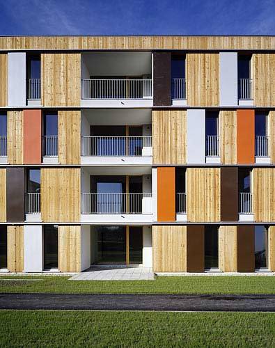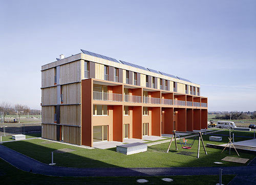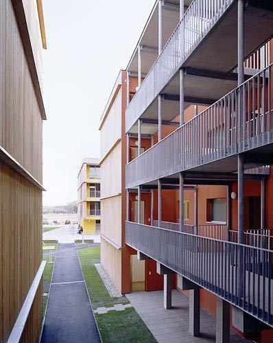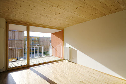 Auf einem Kellergeschoss und einem Erdgeschoss aus Ortbeton lagern drei Holzgeschosse (KLH für die Decken und tragenden Innenwände, hochwärmegedämmte Hohlkasten-Außenwände, Holzfenster), wobei die einheitliche Fassadengestaltung diesen konstruktiven Wechsel nicht zum Ausdruck bringt. Die Decken sowie einzelne Innenwände der Wohnungen sind als besonderes Charakteristikum als sichtbare Holzflächen belassen. Auf ein an sich erlaubtes Dachgeschoss wurde im Hinblick auf das städtebauliche Umfeld verzichtet. Die klare Volumetrie der Baukörper und der Hofraum dazwischen bilden an der Kante von Stadt und Land ein maßvolles entwicklungsoffenes Ganzes. (Text: Gabriele Kaiser)