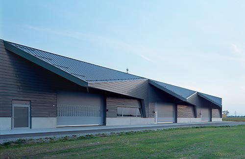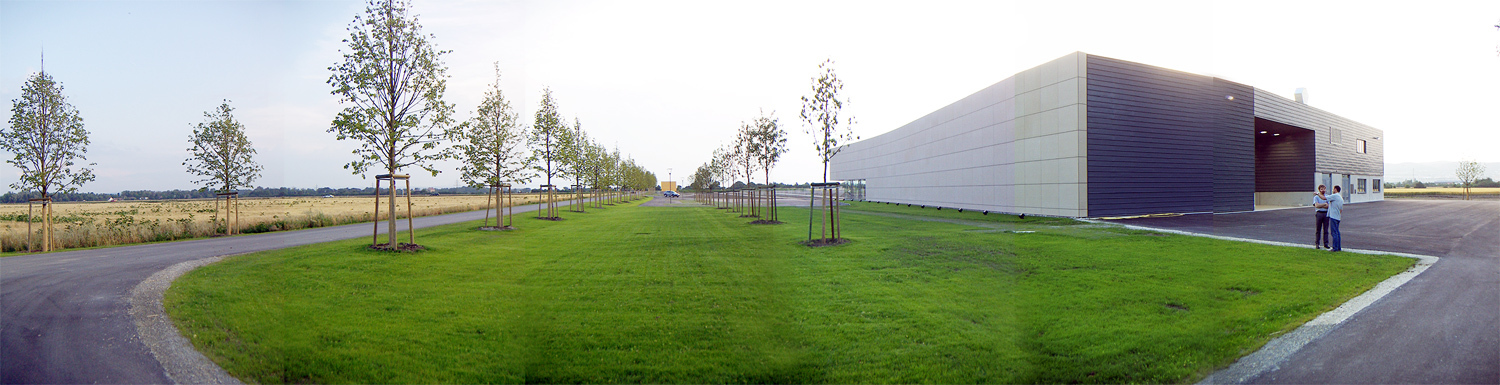 Denn dort, wo Lager und Produktion miteinander verschmelzen, bricht im Erdgeschoss der gläserne Verkaufsraum den Lagerbereich auf und „drückt“ die Wand aus sandfarbenen Faserzementplatten nach oben. Diese „hochgeklappte“ weitauskragende Ecke beherbergt im Obergeschoss den Verkostbereich und eine großzügige Terrasse. Konsequenterweise definiert dieses Material auch im Innenraum des Verkostraumes die Wand. Besonderer Wert wurde auf die Gestaltung der Vordächer (Toreinfahrten, Terrasse, Haupteingang, Zufahrt) gelegt und die jeweilige Öffnung besonders inszeniert. Im Inneren ist das Gebäude geprägt von der Optimierung der jeweiligen Funktionsabläufe und der Trennung von industrieller Produktion und Lagerung/Präsentation des Produktes. Dazwischen trennt eine sich aufweitende Manipulations- und Zufahrtszone diese Bereiche, welche durch eine graduelle Aufweitung auch die Rundung der Faserzementfassade definiert. Nach dem Eintreten durch den klar gefassten Haupteingang wird der Kunde oder Besucher in einem Verkaufsraum empfangen, der gekonnt mit dem Bild des modernen, zeitgemäßen Weinguts spielt. Ein weinroter Boden und eine eindrucksvolle Lehmwand verschmelzen Verkaufsraum und - als Herzstück des Weingutes - das Barriquelager mit den Eichenfässern zu einer Einheit.
