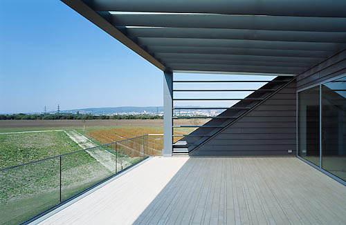 Die Wand aus naturbelassenen Lehmziegeln mit rötlichem Lehmputz verbindet im Kundenbereich die zwei repräsentativen Geschosse und dient neben der optischen Definition des Raumes vor allem der Regulierung der Luftfeuchte. Entlang der Wand gelangt der Kunde über eine rote Stiege ins Obergeschoss, welches für Seminare und Verkostungen genutzt wird. Hier oben liegen die burgenländische Landschaft und die Eichenfässer den Besuchern zu Füßen. An schönen Tagen ist über der pannonischen Weite der Schneeberg sichtbar - an allen Tagen Eisenstadt mit dem Schloss Esterhazy. Im Obergeschoss dienen diese optimierten Räumlichkeiten der Weinpräsentation – unterstützt vom ständigen Bezug zum Barriquelager und zur burgenländischen Landschaft. Der Blick in diese beide Richtungen wird zelebriert durch eine schräge Verglasung zum Barriquelager und durch die lamellen-gerahmte Terrasse zur Landschaft. Das Licht inszeniert die Präsentationsräume abhängig von der Tageszeit. Tief flutet das Licht am Abend über die Terrasse und die Schrägverglasung in das Gebäude – szenisch unterstützt durch lamellenverschattete Fensterschlitze im Dach an den Quermauern. Große Fensterflächen erhellen den Präsentationsbereich, da Naturlicht das beste Licht zum Weinverkosten ist.