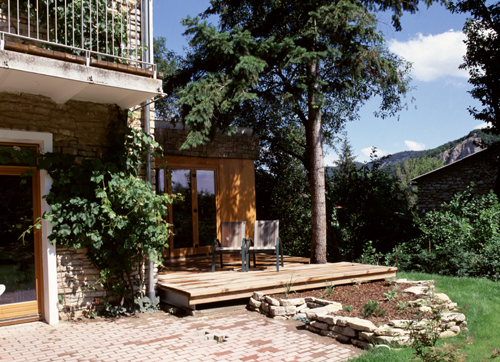 During the planning of the extension we stayed within this architectural medium. The building has been extended with a kitchen and dining room unit and has gone through internal modifications. The entrance has been moved to the street-side front. The dining room is connected to the fine backyard by a southwards orientated deck. On the street-side front the entrance can be seen through a small opening, while the larger corner window looks onto the attractive alpine garden nearby.