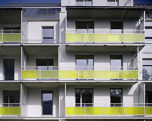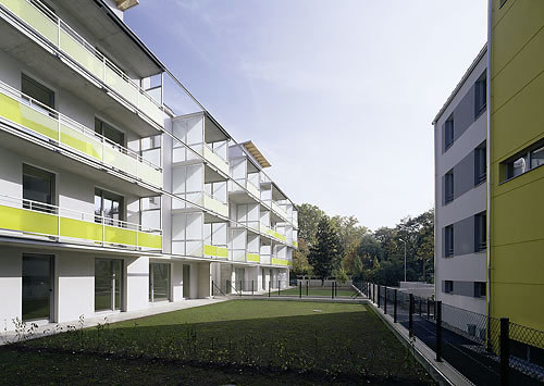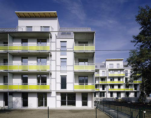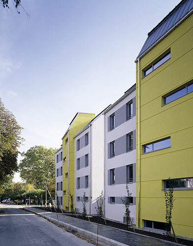 Die drei Passivhäuser mit je 13 Wohnungen auf einer gemeinsamen Tiefgarage bieten allen Appartments eine südseitige Freifläche (Mietergarten, Balkon, Loggia oder Terrasse). Die Außenhülle der Stahlbetonkonstruktion ist absolut luftdicht, die dreifach verglasten Fenster leisten dazu ebenfalls einen Beitrag. Das Gebäude ist von der Tiefgarage thermisch entkoppelt, um Kältebrücken zu vermeiden erfolgt die Lastabtragung nur über wenige Auflagerpunkte. Die Wohnhausanlage ist mit einer hocheffizienten Komfortlüftung mit Wärmerückgewinnung aus der Abluft ausgestattet, zusätzlich gibt es eine zentrale Gas-Brennwertanlage für die restliche Erwärmung bzw. Aufbereitung des Warmwassers. Die (geräuschlose) Lüftungsanlage versorgt sämtliche Räume ständig mit reiner gefilterter Frischluft, dennoch ist es – entgegen manchem Vorurteil - natürlich möglich, ab und zu ein Fenster zu öffnen. (Text: Gabriele Kaiser)