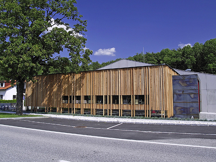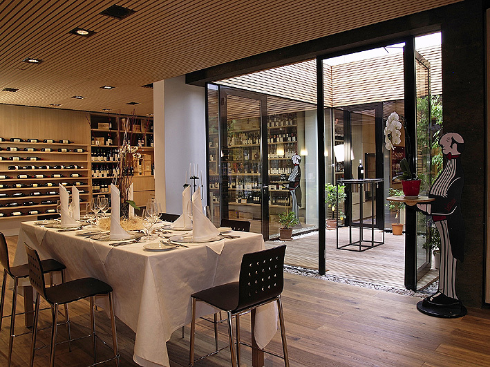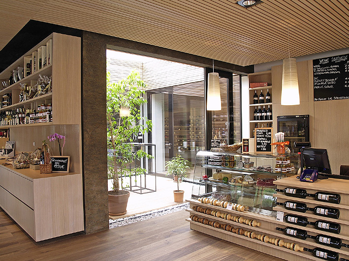 nach innen öffnet sich die vinothek durch ihr herzstück, das atrium, das nicht nur als lichtspender dient, sondern auch unmittelbar neben der vielbefahrenen bundesstraße144 für den gast eine ruhefläche im freien schafft. weiters gelingt es über diesen lichthof, den umgebauten bestand gleichwertig und optimal einzubinden und als verkaufs-, veranstaltungs- und seminarfläche bestens zu nutzen.