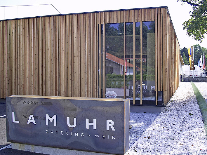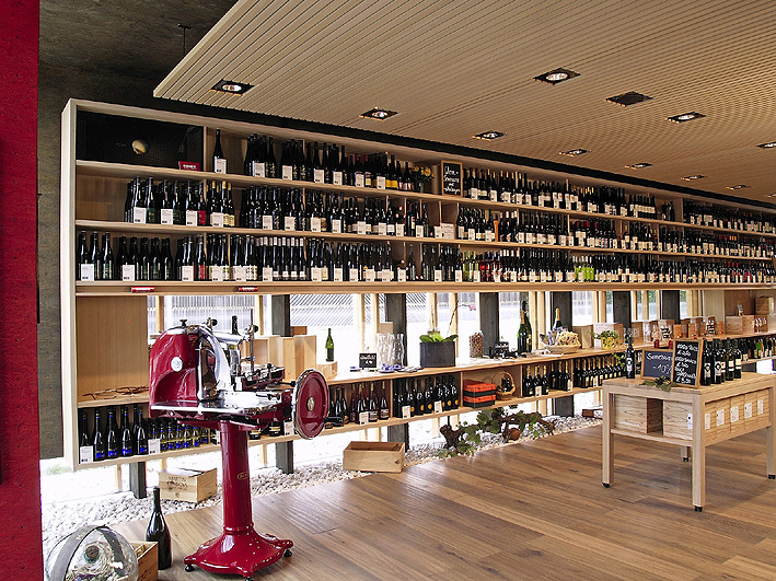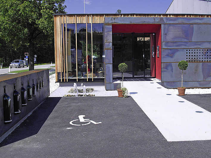 ausgangspunkt der planung war die grundidee, den baukörper auf grund der nahen situierung zur bundesstraße, nach außen hin zu schließen und nach innen zu öffnen. daher wird die zur bundesstraße geschlossen fassade lediglich durch den untersten durchlaufenden glasschlitz, durch den man auch von innen die außenanlagen erkennen kann, sowie durch das lichtband, welches als werbeträger dient, durchbrochen. nord- uns südseitig öffnet sich die vinothek durch eine großflächige glasfassade. dieser durchlaufende innenraum ist auch in der gestaltung der außenanlage, unter anderem in den kiesflächen, den wassersprudlern und der bepflanzung weitergeführt.