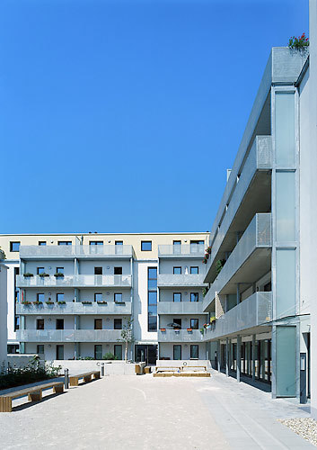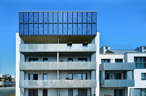 Aufgrund der dezentralen Heizung und Warmwasserbereitung entfallen jegliche Kosten für Heizungs- und Warmwasserleitungen sowie für Wärmemengen- und Warmwasserzähler. Gleichzeitig werden auch jegliche Wärmeverteilverluste und die Kosten für Grundgebühren, Wärmemengenmessung, Zählertausch und Wartung dieser Komponenten vermieden. Die Einbindung der Photovoltaikanlage als integrativer Bestandteil des Entwurfes bildet ein sichtbares Symbol für Nachhaltigkeit und die Versorgung des Projektes mit erneuerbaren Energien. Sie fördert die Identifikation der Bewohner mit dem ökologischen Konzept. (Text: Architekten)