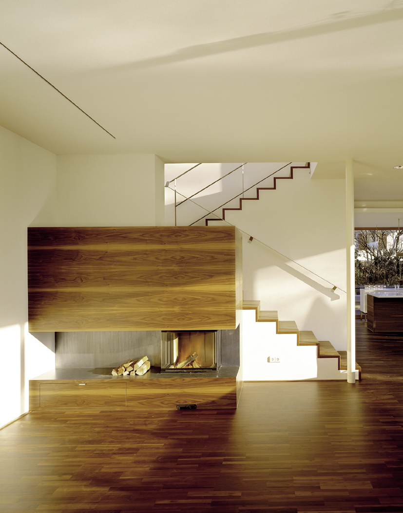 Durch eine 25 Meter lange Glasfassade fällt der 7000 Quadratmeter große Garten mitsamt Biotop, Nutzgarten und Meditationsplatz in den Raum. Direkt vor dem L-förmigen Wohnraum liegt die Terrasse. „Derartige Freiräume sind in unserem Klima eine kostengünstige Wohnzimmererweiterung“, befindet Wohofksy, „wir setzen diese Elemente in unseren Projekten häufig ein.“ Das Resultat kann sich sehenlassen: Das 240 Quadratmeter große Haus wirkt erheblich größer, als es ist.