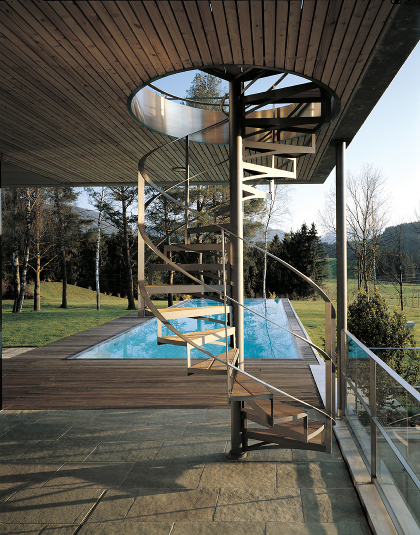 Während die beiden unteren Geschoße in Sichtbeton gefertigt wurden, ist der oberste Stock als Holzständerkonstruktion ausgeführt und dementsprechend leicht und transparent. Über eine offene Holztreppe, die wie ein Möbelstück im Raum steht, gelangt man nach oben. Im Zentrum befindet sich die langersehnte Sauna. Vom Ruheraum, der direkt davor liegt, gelangt man ins Schlafzimmer und anschließend ins Bad. Über eine Outdoor-Wendeltreppe kann man nach dem Saunieren frische Luft schnappen: raus in den Garten und rein in den Pool, der mit schwimmtauglichen 12,50 Metern aufwartet.
