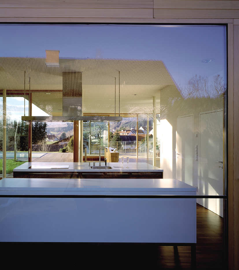 Nicht zu vergessen das Kunstwerk an der Fassade: Um die Bewohner im Obergeschoß vor Sonne und Blicken zu schützen, wurden vor die Fenster Aluminiumrahmen mit einer Bespannung aus speziellem Sonnenschutzgewebe montiert. „Weil Glas allein in unseren Augen keine voll funktionstüchtige Außenhülle ist, haben wir eine doppelte Fassade entwickelt“, sagt der Architekt. Bedruckt wurden die cremefarbenen Screens übrigens mit den Visuals von Herwig Baumgartner, einem befreundeten Künstler. Mittels Fernbedienung können die Schiebeelemente je nach Stand der Sonne hin und her bewegt werden.
