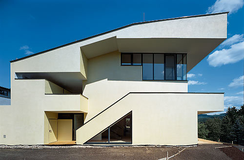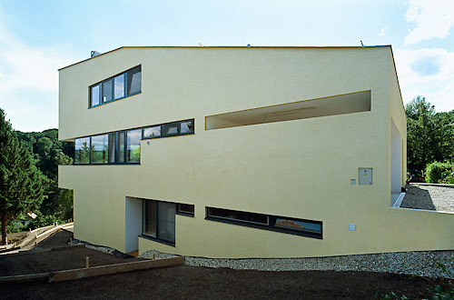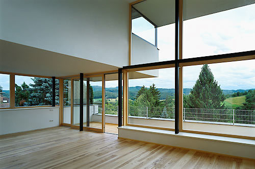 Oben haben auch die Eltern ihr Bad und Schlafzimmer, der krönende Höhepunkt aber ist der Musikraum. „Das war das Wichtigste,“ sagt Architekt Gerhard Binder. „Der Bauherr wollte konzentriert arbeiten können, aber doch nicht ganz losgelöst von der Familie sein.“ Schallgedämmt und akustisch abgekoppelt, ruht er als eigene Holzleichtbaukonstruktion auf dem Sockel der Küche. Die Wandnische an seinem stillen Hinterende birgt Archiv und Bibliothek des Bauherren, vom Fenster seines Arbeitstisches sieht er die Morgenröte über den Hügeln aufsteigen. Von dem auskragenden, über-eck-verglasten Platz, an dem sein Flügel steht, aber kann der Blick hinunter zu seinen Lieben ins Wohnzimmer und weit über die Felder hinaus schweifen. Unter der Decke, die in einer Flucht die weit vorstehende Untersicht der Dachskulptur mündet, entschwebt der freie Geist in diesem Cockpit der Musik gleichsam in die Weite von Landschaft und Himmel. (Gekürzter Text der Architekten)