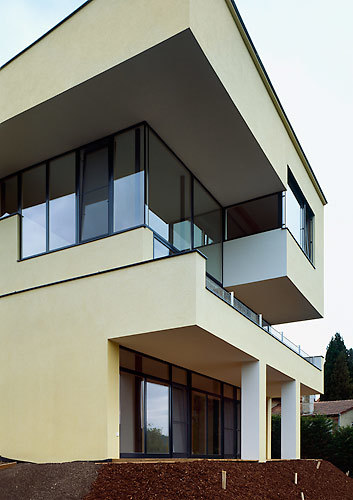Die Architekten meißelten aus dem Südhang, von dem man über die Nachbarn hinweg auf unberührte Felder sehen kann, eine monolithische Hausskulptur auf den Geländerücken, die nach allen Regeln der Raumkunst den Ausblick zelebriert und auf drei Ebenen dem Schlafen, Wohnen und Musizieren das richtige Ambiente schafft. Für den zarten Schimmer sorgt der Metallic-Anstrich mit seinen reflektierenden Pigmenten: wie ein wertvoller Stein, der in der Sonne zu glänzen beginnt, liegt der langgestreckte Baukörper nun in der Landschaft.