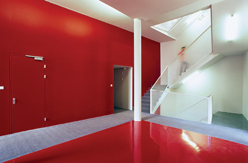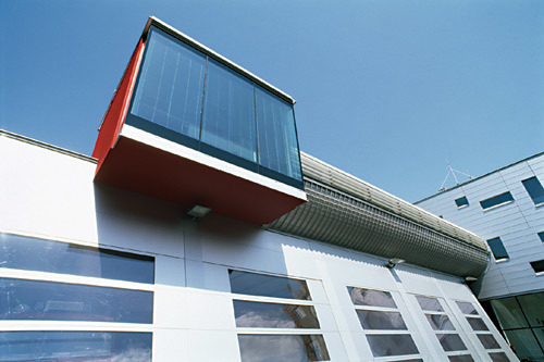 Im Entwurf der Wettbewerbssieger Hadler bis Hausdorf Architekten lag besonderes Augenmerk auf der städtebaulichen Situation am Hauptplatz des klassischen Straßendorfes Kaltenleutgeben, der Markierung einer Ortsmitte in der linearen, an der Hauptstraße aufgereihten Ortschaft durch öffentliche Nutzungen und eine Fassung des weiträumigen Platzes. Die langgestreckte Fahrzeughalle und ein dreigeschossig querstehender Bauteil bilden ein L-förmiges Ensemble, das das nordöstliche Eck des Hauptplatzes fasst und diesem eine klare Form gibt, sowie durch Verengung des Straßenquerschnittes eine Torsituation bildet und dadurch in der Raumsequenz Hauptstraße deutlich den Beginn der Ortsmitte markiert. Ein freistehender Turm greift ein ortstypisches Element auf und bildet mit dem Rathaus und der Professorenvilla den Abschluss einer Reihung von vertikalen Akzenten am Hauptplatz. Für die Fassade werden wenige Elemente – silberne Alucabont-Fassade, bündige DOMICO-Verglasung und zwei signalrote Kanzeln – vielfältig kombiniert. So legt sich um die oberen Geschosse des Querriegels eine Lochfassade mit kaschierten Fensterstöcken, die die Fassadengliederung des benachbarten Wohnbaus aufgreift und spielerisch in den Platz überleitet. Das Geschäftslokal im Erdgeschoss öffnet sich mit seiner geschwungenen Planarverglasung zum Platz. Die schräggestellten verglasten Garagentore fungieren als Schaufenster für den Fuhrpark der Feuerwehr, darüber wölbt sich der Mehrzwecksaal als geschwungener, mit Sehschlitzen akzentuierter Körper nach vorne. (Text: Architekten)