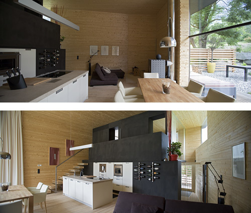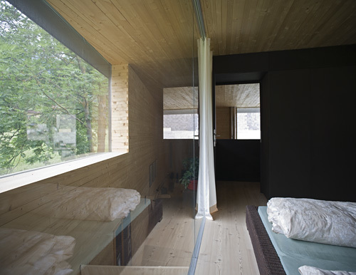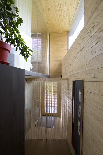 Wenig Geld, ein kleines Grundstück, viele Wünsche und große Ansprüche – wie macht man daraus ein Haus? Durch den Verzicht auf nicht unbedingt erforderliche Dinge und durch gute Ideen! Auf den ersten Blick wirkt das Objekt fast wie ein kleines Ferienhaus. Umso überraschender ist es, wie großzügig das Gebäude im Inneren wirkt. Wie überhaupt die Unterschiedlichkeit der inneren und äußeren Wahrnehmung prägend für das Haus ist. Nach außen ist es ein kleines, auf dem Bauplatz ganz lapidar abgestelltes „Kästchen“, mit einer Fassade aus schwarz gestrichenen OSB-Platten, wenigen, präzise ausgeschnittenen Öffnungen und einem kleinen gekiesten Vorplatz. Innen wird daraus ein, mit einer groben, dennoch fast kunstvoll wirkenden Fichtenlattung ausgeschlagenes, sehr wohnliches Raumkontinuum, das durch die Dominanz des gebäudehohen Wohnraumes wohltuend großzügig ist. Die Details sind einfach und erfrischend unkompliziert, sie unterstreichen den zurückhaltenden Duktus des Gebäudes, dessen einziger Luxus aus dem zur Verfügung stehenden Raum besteht. Die Nebenräume sind durchdacht und kompakt gestaltet, ohne auf Raumqualitäten verzichten zu müssen. Unterstrichen wird die Großzügigkeit der Innenräume durch ein schönes, sehr großes Fenster zum kleinen, intimen Garten. Das Gebäude ist ein gutes Beispiel dafür, dass eine erfolgreiche Zusammenarbeit von Bauherr und Architekt nicht abhängig ist von einem großen Budget, sondern von den vorhandenen üppigen Ideen und der Bereitschaft, mitunter aus der Not eine Tugend zu machen. (Jurytext: Florian Nagler)