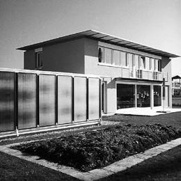 Der vorgestellte Bau von Christian Lenz ist sehr klar proportioniert, der Grundriß auf 7 x 14 m in zwei Quadrate eingeschrieben und von der Nord- zur Südseite in durchgehende Längsschichten zoniert. Massivbau mit zusammengefassten Öffnungen aus Leichtelementen und Flachdach in Holzkontruktion. Die westlich vorgesetzte Auto- und Fahrradgarage bildet ein weiteres, hinter die Erschließungsachse des Hauses gerücktes Quadrat, schirmt den Eingang und die Gartenterrasse ab und definiert einen internen Vorplatz. (Text: Otto Kapfinger in „Baukunst in Vorarlberg seit 1980, Hrsg. VAI / KUB“)