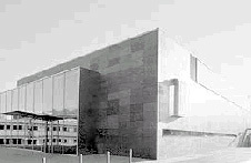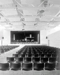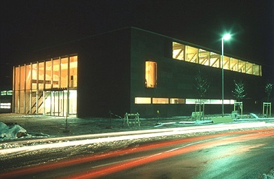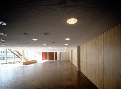 Notwendig und richtig auch der nächste Schritt, als Ergänzung zur rückgewonnenen historischen Mitte um die Kirche ein zweites Ortszentrum an der auch schon „eingewachsenen“ Umfahrung zu entwickeln. Kein vitales Herz funktioniert mit nur einer Kammer. Kaum zehn Gehminuten von der Kirche entfernt ist ein markanter Gemeindesaal, eingebettet in einen Stadtpark, neben dem Vereinshaus und einer Schule entstanden. Lothar Huber aus Lustenau und das mittlerweile erfolgreich allein agierende junge Team Andreas Cukrowicz und Anton Nachbaur-Sturm aus Wolfurt haben 1994 den Wettbewerb gewonnen und 1998 einen Veranstaltungsbau realisiert, der für das langfristige Ziel einer zumindest bipolaren Siedlungsorganisation eine feste Wurzel schlägt.