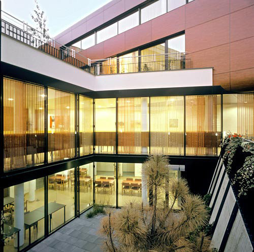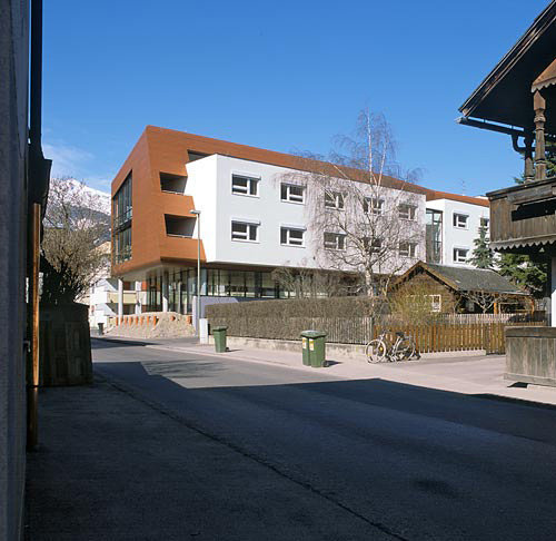 Im nördlichen Stadtteil von Lienz befindet sich mit dem „Wohn- und Pflegeheim Lienz“ eines der größten Pflegeheime Tirols. Nach über 30 Jahren Bestand entsprach vor allem die Küche nicht mehr den heutigen Anforderungen und dem durch die ständige Zunahme der Speiseeinheiten (Essen auf Rädern) benötigten Raumbedarf. Auf der anderen Seite stand ein dem Haupttrakt vorgelagertes Personalhaus schon seit Jahren leer.Mit dem Um- und Zubau wurden diese Bereiche neu organisiert und den Bedürfnissen und dem Selbstverständnis der heutigen, betagten Heimbewohner:innen entsprechend adaptiert. Die öffentlichen Räume des Heimes wie Eingangshalle, Café, Speisesaal und Küche wurden zum städtischen Raum hin orientiert und das Heim damit wieder an die Stadt angebunden. Gleichzeitig wurde die Chance genutzt, eine völlig neue Dementenstation zu errichten. Der mit Maxplatten verkleidete zweigeschossige Baukörper, schwebt – trotz seiner scheinbaren Schwere – über dem vollständig verglasten, zurückgesetzten Speisesaal hinaus zur Beda Weber-Gasse. Seine organische Grundform erlaubt eine volle Raumausnutzung bei minimaler Beeinträchtigung des Bestandes. Gleichzeitig schuf die völlige Neugestaltung des Vorplatzes einen zusätzlichen wohnlichen Aufenthaltsbereich vor dem Haupteingang. (Text: Claudia Wedekind nach einem Text des Architekten)