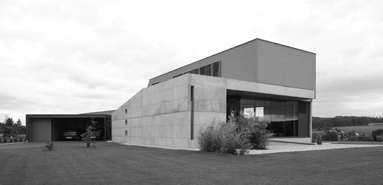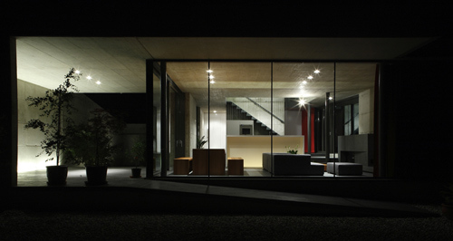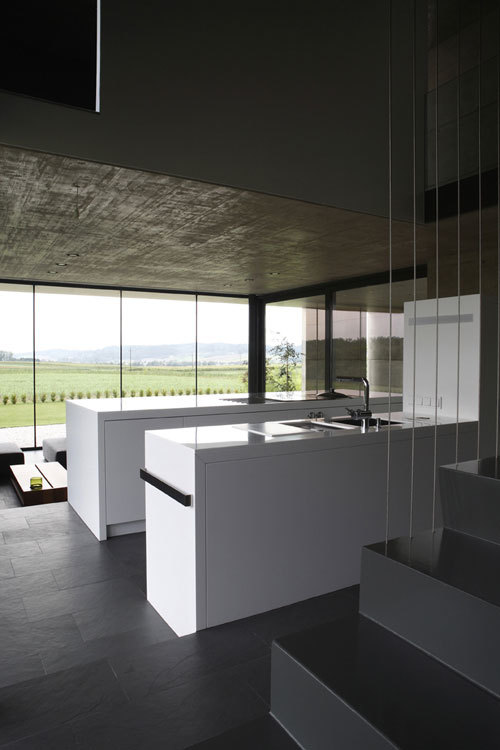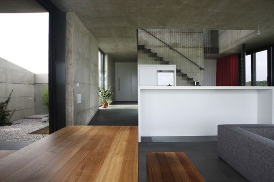 Das Erdgeschoss beherbergt neben dem Wohn-/Essbereich eine kleine Gästezone samt Bad und WC. Vom Eingang nebst Garderobe betritt man einen großzügigen Raum, der im Bereich der Küche zweigeschossig wird und räumlich mit dem Obergeschoss verwächst. In mehreren Niveaus treppt sich der Raum von der Küche zum Wohnbereich hin ab. Dieser ist über Eck verglast und lässt sich auf einer Seite mittels einer großen Schiebetür zur überdachten und windgeschützten Terrasse hin erweitern. Als Endpunkt schließt der begrünte Innenhof mit kleinem Wasserbecken an diesen Bereich an.