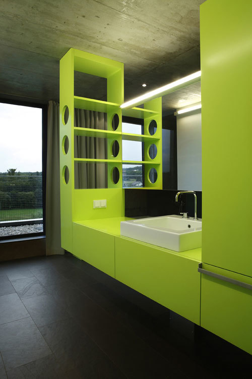 Im Obergeschoss befinden sich die Schlafräume, Bad/WC und ein zum Luftraum hin orientierter Arbeitsplatz. Das Untergeschoss beherbergt neben dem Wellnessbereich und den nötigen Kellerräumen als Besonderheit auch einen Weinkeller, der durch eine Verglasung im Boden vom Wohnraum aus einsichtig ist. (Text: Ronald Mikolics)