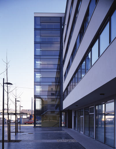 The location of the site between the bleak area flanking the South Railway route on the one hand, and the populated pedestrianized Favoriten Street with its easy subway access on the other, creates a peculiar kind of urban ambiance. Unit B consists of a long, seven-story tall structure parallel to Humboldt Street and four rows which jut out of the long building like the teeth of a comb.