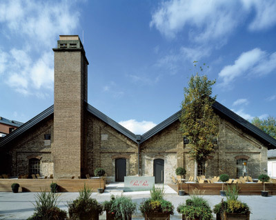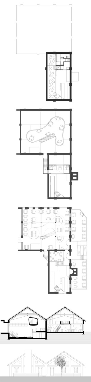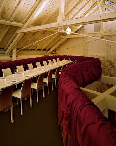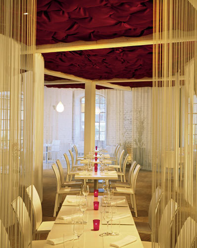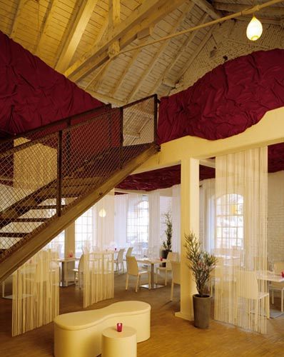 Der erste Blick des Gastes fällt auf eine neue frei gestellte organische Plattform im ersten Obergeschoss, die mit ihren weichen geschwungenen Linien und ihrer knallig glänzenden Farbe (Farbton des Logos) im Kontrast zum übrigen komplett ausgekalkten (weiß gestrichenem) Innenraum steht. Von dieser Plattform abgehängte Vorhänge zonieren den Grundriss in verschiedene Sitzbereiche. Die bestehende Treppe wurde erhalten und lediglich in den Raum gedreht und an die neue Ebene angeschlossen. Alle Ziegelsteinwände sowie der Dachstuhl wurden weiß gekalkt bzw. versiegelt. Auf diese Weise wird die originale ursprüngliche Bausubstanz in ihrer Rauheit erhalten und für die saubere Nutzung eines Restaurants entsprechend aufbereitet.