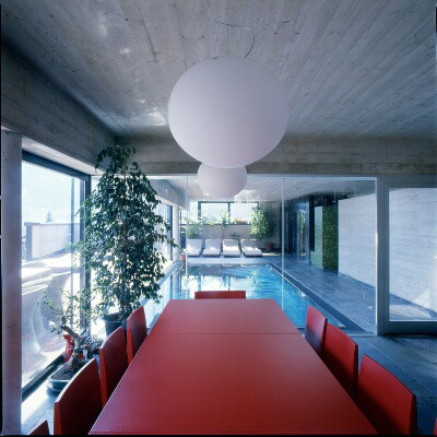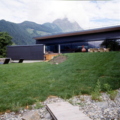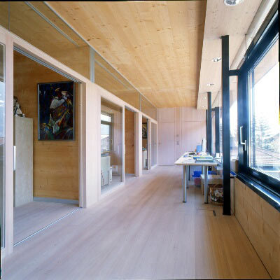 Das Erdgeschoss ist ein großer loftartiger Aufenthaltsbereich, der Wellnessbereich mit Schwimmbad in den Lebensraum, Küche und Wohnzimmer integriert. Das Obergeschoss ist Schlafgeschoss mit Bibliothek und Dachterrasse mit herrlicher Aussicht. Den Kinderzimmern vorgelagert ist ein „Spielflur“. Die hochgezogenen nordseitige Wand auf der Terrasse schützt vor dem kalten „Tauernwind“. (Gabriele Kaiser nach einem Text des Architekten)
