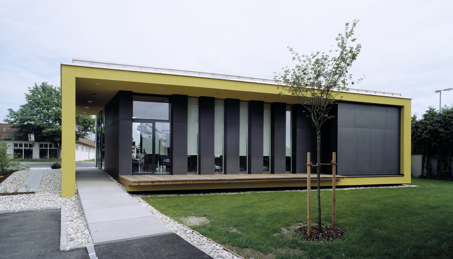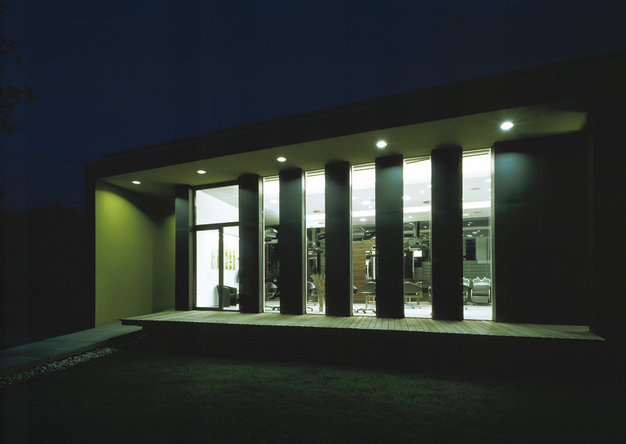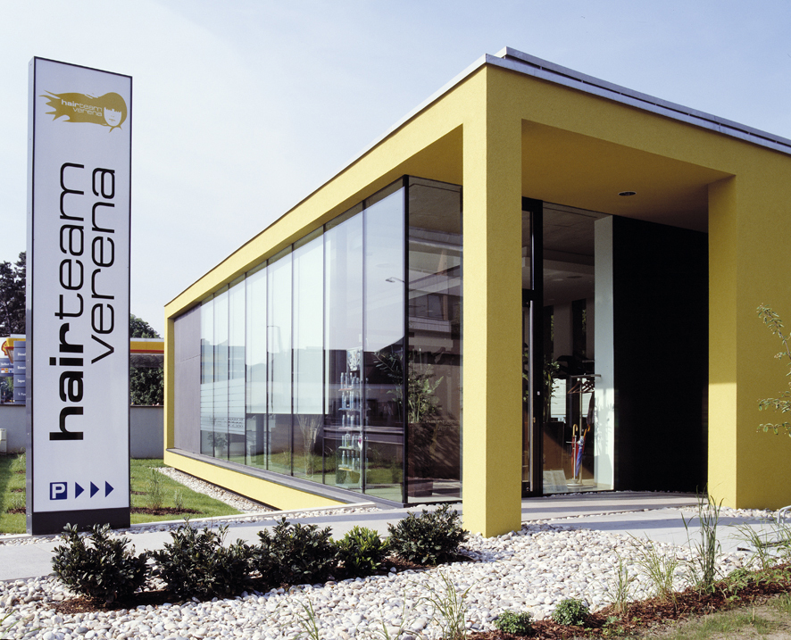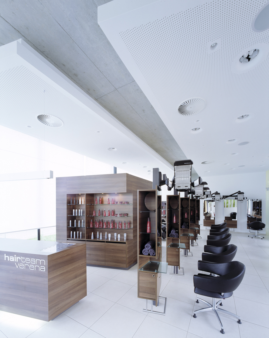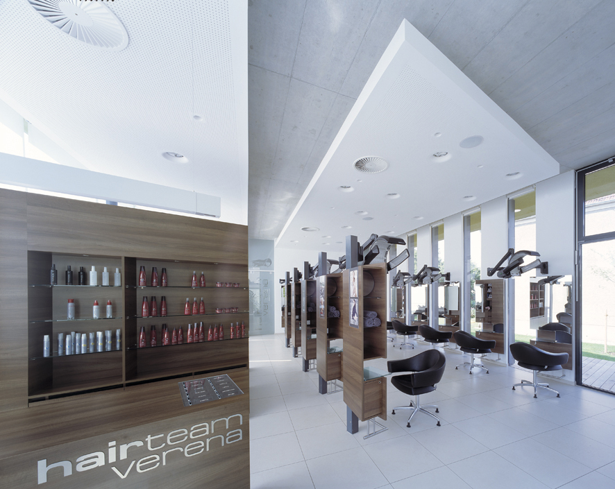 Die in besonderer räumlicher Anordnung aufgestellte Möblierung, strukturiert den Kundenraum. Vom Empfang vorbei an einer frei in den Raum gestellten Laborbox über den Waschplatz an der Straßenfront entwickelt sich der Raum zu den Frisierplätzen, die den vertikalen Rhythmus der Gartenfassade im Wechsel von Spiegel und Fenster weiterführen. Der Raum ist, vom hellen keramischen Boden über die Wände bis zu den beiden unter die graue Sichtbetondecke gehängten multifunktionalen Deckenelementen annähernd weiß. Die Einbaumöbel aus dunklem Holz bilden den Ordnung schaffenden Kontrast.Im südlichen, geschlossenen Teil des Gebäudes sind die Nebenräume und der Personalraum angeordnet, welcher auch über einen Austritt auf die Terrasse verfügt. Architekten