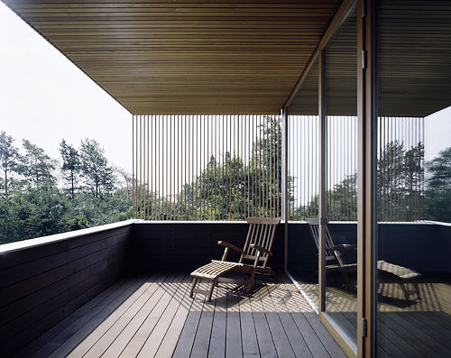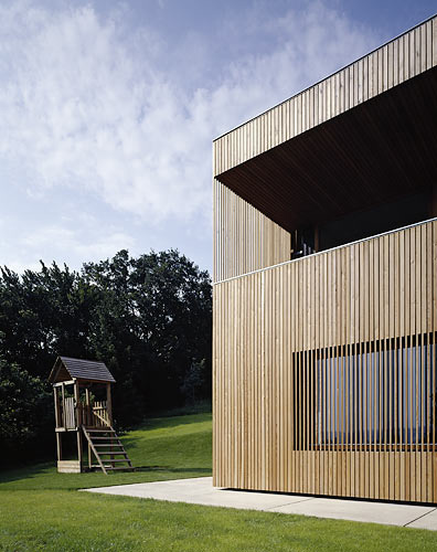 Der Neubau besteht aus einer 2-geschossigen Beton – Holz – Mischkonstruktion. Das Untergeschoss besteht aufgrund der Hanglage überwiegend aus einer Betonkonstruktion außer dem nordostseitigen Bereich mit den Kinderzimmern. Dieser Bereich wurde als Holzkonstruktion (Decke über UG) errichtet. Das Obergeschoss besteht aus einer Holzkonstruktion (Wände und Dach) mit teilweise eingebauten Stahlstützen als tragende Elemente. Die auskragenden Vordächer im Bereich der Terrassen Nord und Süd werden über auskragende Kragträger gehalten. Der Holzbau wurde als vorgefertigter Elementbau ausgeführt, teilweise mit gedämmten Hohlkastenelementen, teilweise mit Massivholzplatten. Den Außenwänden ist eine vorgehängte vertikale gegliederte Holzleisten-Fassade vorgehängt. Über diese unüblich weit vorgehängte Fassade soll ein Teil der direkten Besonnung und der damit verbundenen Bauteil-Aufheizung reduziert werden. Ferner bildet der Fassadenschirm einen erhöhten Wetterschutz der Holzbauteile und trägt auch optisch zum luftigen Erscheinungsbild des Gebäudes bei. Der Fassadenschirm ist in Teilbereichen ausgenommen und verläuft über die dahinterliegenden Fensteröffnungen. Drei große Fixverglasungen werden flächenbündig in die vorgehängte Fassadenkonstruktion eingebaut, die dafür notwendigen Unterkonstruktionen wurden außenseitig auf die Außenwandelemente befestigt. Durch die außen flächenbündigen Fenster entsteht auf der Innenseite jeweils eine tiefe Fensterlaibung, die als Sitzbank genutzt werden kann und durch die sich oben wie seitlich um ca. 30 Grad nach innen verjüngende Laibung ergibt sich ein immer wieder verblüffender Postkartenblick (Schaufenster in den Weingarten). Bergseitig ist der Gartenbereich atriumartig mit Stützwänden und einem Pool angelegt. Der Privatbereich wird gegenüber dem angrenzenden Grünland klar definiert. Der Pool ist auf einer Betonplatte aufliegend, die Stützwände sind als Betonwände konstruiert, um den Pool und entlang des Gebäudes gibt es einen Holz – Terrassenrost. Im Eingangsbereich und entlang der beiden Hausseiten wurden Betonfertigteilplatten verlegt. Als Heizungssystem wurde eine Wärmepumpe mit einem Erdkollektor installiert. Die Beheizung erfolgt über Fußbodenheizungen, im Leibungsbereich der großen Fixverglasungen und in angrenzenden Wandflächen über Wandheizungen. Im Obergeschoss wurde ein Holzofen mit Edelstahlkamin eingebaut. Zusätzlich wurde eine kontrollierte Be- und Entlüftung mit Wärmerückgewinnung eingebaut. (Text: Johannes Kaufmann)