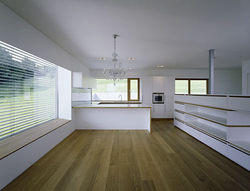 Das Obergeschoss ist in einen großzügigen Ess-Kochbereich und einen Wohnbereich, sowie einen Schlaf-Ankleiden-Badbereich gegliedert. Die Räumlichkeiten wurden je nach Nutzung durch die Ausblicke sowie durch die Belichtung und Exponierung differenziert.