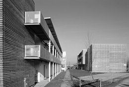 Zwei spartanische, SW-orientierte Zeilen direkt neben dem Bahndamm. Erschließung durch bahnseitige Laubengänge, als minimale Metallstrukturen mit Eternitbrüstungen an die verputzten, dreigeschossigen Baukörper angehängt; südwestseitig analog vorgesetzte Balkone mit leuchtend bunten Brüstungen und Abschirmungen in Mattglas.Keine Keller, statt dessen gestapelte, in Holzlattung gehüllte Abstellboxen, mit den Laubengängen am Ostende jeder Zeile verbunden. Zwei- und Dreizimmerwohnungen. (Text: Otto Kapfinger in „Baukunst in Vorarlberg seit 1980, Hrsg. VAI / KUB“)