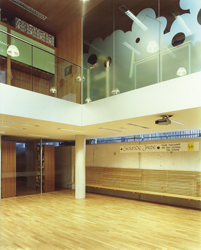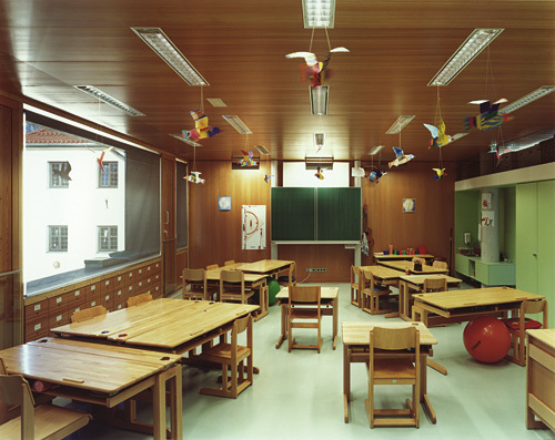 Das Raumprogramm war relativ bescheiden: Drei Klassenräume, drei Gruppenräume, drei Garderoben, jeweils auf einer Ebene organisiert – also Erdgeschoß und zwei Obergeschoße –, unten der abgesenkte Mehrzwecksaal und eine gläsern abgetrennte Bibliothek. Die innere Organisation ist also sehr einfach, der Innenausbau hat aber seine edlen Komponenten. Denn dadurch dass bei einem Sichtbetonbau die Wärmedämmung logischerweise innen liegen muss, konnte man innen „verkleiden“ – mit Lärchenholz, das hier in einer überraschend guten Qualität verarbeitet wurde.