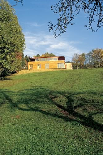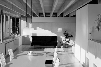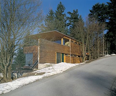 Da die Straße hinter dem Haus um ein Stockwerk ansteigt, liegt der Carport (über eine kurze Brücke erreichbar) im Obergeschoss überdacht an der Nordseite des Hauses. Leimbinder mit großen Spannweiten und Sperrholzplatten bilden die sichtbare Decken- und Dachkonstruktion. Durch verglaste Zwischenräume am Auflager der Auskragungen erscheint sie besonders leicht. (Text: Otto Kapfinger in „Baukunst in Vorarlberg seit 1980, Hrsg. VAI / KUB“)