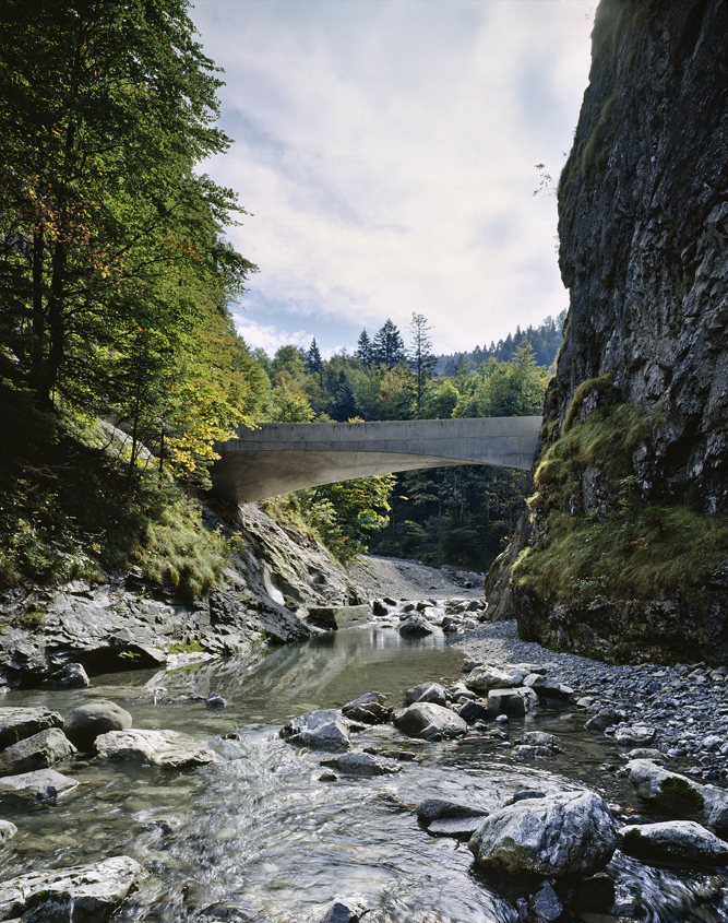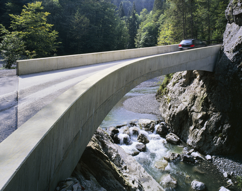 Gedacht aus der Typologie der Steinbogenbrücke ist sie das Ergebnis einer Ausreizung der Bogenform mit modernen Technologien. Um der Unterforderung des Stahlbetons entgegen zu wirken, wurde der Bogen auf ein statisches Minimum reduziert und zusätzlich einer Verwindung unterzogen. Diese reagiert auch auf den beidseitig in Krümmung wegziehenden Straßenverlauf und wird so zur betonierten Skulptur. So unspektakulär die Brücke sich in der Draufsicht oder der Perspektive des Fahrers ausnimmt, so faszinierend präsentiert sie sich vom Ufer der sich durch die Klamm windenden Ache: spielerisch mimt sie die gefrorene Dynamik der Bergstrecke und macht die Dramatik des Ortes in Stahlbeton manifest. Formvollendete Ingenieur- und Gestalterleistung präzise eingespannt in das umliegende Naturspektakel. (Text: Marina Hämmerle)