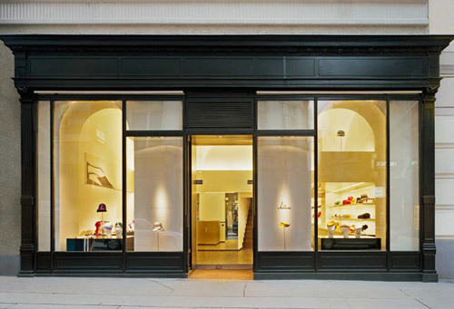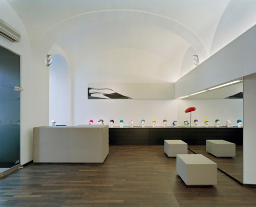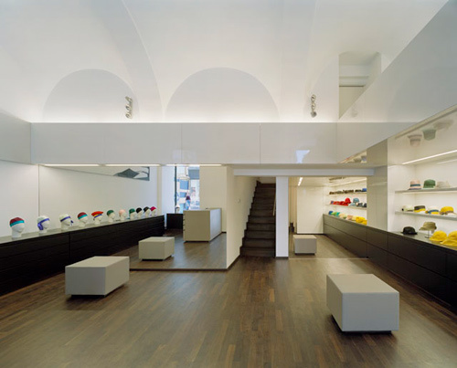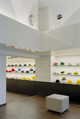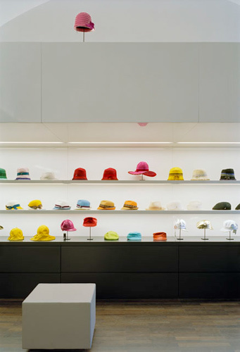Mit einem relativ klassischen Ladenportal und dem rührend altmodischen Firmen-Logo in der Auslage trägt der Flagship-Store in der Seilergasse den traditionellen Werten des Unternehmens Rechnung, während die Farben- und Formenvielfalt der Hüte selbst im klaren wie artifiziellen Inneren des Flagshipstores bestens zur Geltung kommt. Ein lineares System beleuchteter Displaybänder präsentiert eine große Anzahl von Hüten auf begrenztem Raum (60 m²) und lässt sie wie Fragmente von Büsten erscheinen, die auf ihre Vervollständigung durch Charakterköpfe ungeduldig zu warten scheinen. (Text: Gabriele Kaiser)