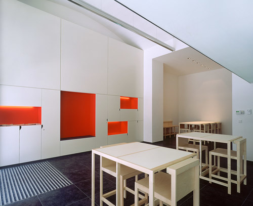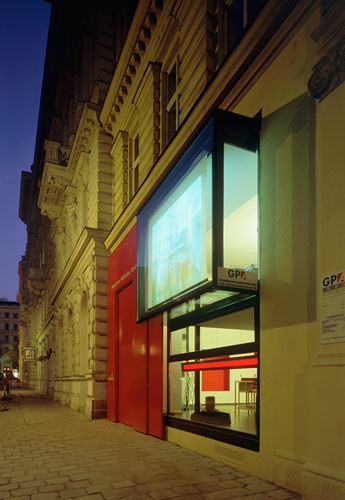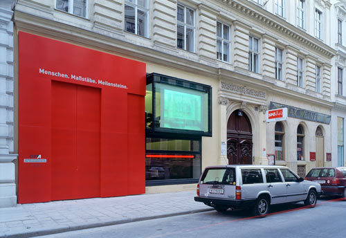 Der Slogan „Menschen.Maßstäbe.Meilensteine“ mag die Aufmerksamkeit der Passanten zusätzlich auf das 100 m² große Infolokal lenken. Nach Ladenschluss hingegen, wenn die roten Schiebeelemente aus Metall vor den Eingangsbereich geschoben werden, fällt der Blick unweigerlich auf den hervorspringenden Glaskubus, der auch als Projektionsfläche für aktuelle Projekte dient. Ein Laufschriftband liefert zusätzliche Infos über Erreichbarkeit oder die Präsenz der WBV-GPA im Internet. (Text: Gabriele Kaiser)