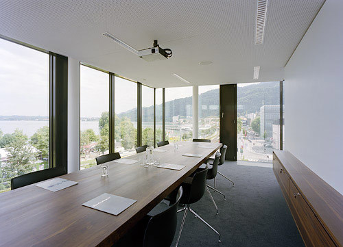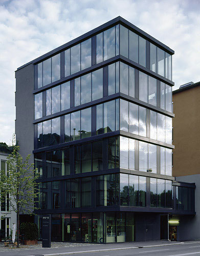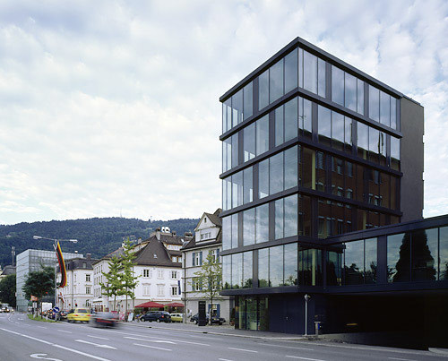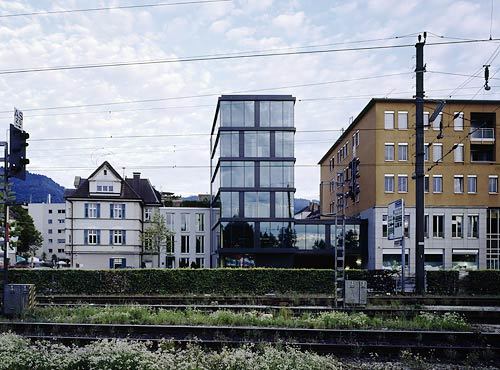 Neben dem sechsgeschossigen Turm, der im Erdgeschoß Läden und darüber Büros enthält, schließt zur Rechten, über der Ein- und Ausfahrt einer Tiefgarage ein eingeschossiger Gebäudeteil an, der den Büroräumlichkeiten auf diesem Stockwerk zugeordnet ist. Zur Linken ist zwischen dem rückwärtigen Gebäudeflügel des Büroturms und dem gründerzeitlichen Haus an der Ecke ein bescheidenes, dreigeschossiges Gebäude eingefügt, das hinter einer ruhigen, wohlproportionierten Fassade mit französischen Fenstern im Erdgeschoß ein Geschäft und darüber zwei Kleinwohnungen enthält. Es ersetzt einen baufälligen Vorgängerbau. Die Fassade des Büroturms ist geschoßhoch verglast, die Betondecken liegen auf schlanken Rundstützen auf und ihre Stirnen werden in der Fassadengestaltung betont, sodass die Stockwerke deutlich ablesbar sind, was der Maßstäblichkeit des Bauwerks und der Integration in die kleinteilige Nachbarbebauung förderlich ist. Von den oberen Geschossen genießen die Arbeitenden über Seestraße und Bahn hinweg die Aussicht auf das Grün des Parks am Ufer und den See. Mit seiner gedrungenen Form und der architektonischen Durchbildung der Fassade korrespondiert dieser Turm städtebaulich mit jenem vor der Wohnanlage „am Hafen“. Er spielt für diesen gleichsam die Rolle des „kleineren Bruders“, mit dem er im Blickkontakt steht. Beide reihen sie sich in die mit ähnlich proportionierten Türmen, wie dem Kunsthaus Bregenz und dem Bühnenturm des Theaters gut bestückte Seeseite der Stadt Bregenz, die in diesem Abschnitt – durchaus sinnvoll – nicht aus einer geschlossenen Front besteht, sondern aus einer durchlässigen Reihe teils unterschiedlicher Solitäre. (Text: Walter Zschokke)