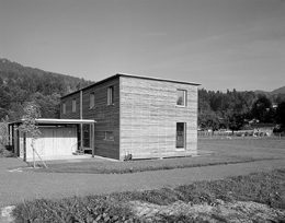Außenwände massiv aus vertikalen, 10cm starken Kantelholzdielen, Queraussteifung durch dahinterliegende OSB-Platte; Wärmedämmung; die außenliegenden OSB-Platten und Konterlattung auf die Dielen durchgeschraubt. Decken und Dach aus ähnlichen Elementen (insgesamt 14 pro Haus) mit fertigen Unterseiten, Brandschutz ohne zusätzliche Maßnahmen. Bodenplatte direkt auf Piloten aufgelegt, hinterlüftet. Ökonomie und Baubiologie in qualitativer Balance. (Text: Otto Kapfinger in „Baukunst in Vorarlberg seit 1980, Hrsg. VAI / KUB“)
