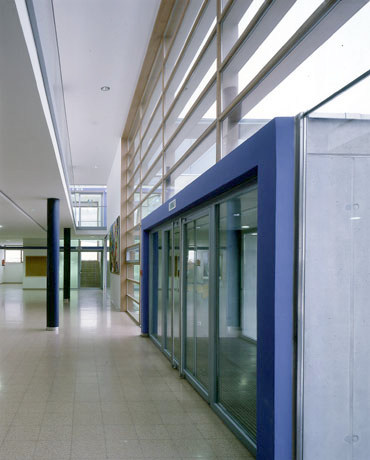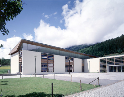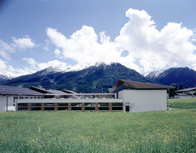 Der neue Haupteingang führt in die zweigeschoßige Halle des Verbindungstraktes. Sie dient als Foyerbereich und Pausenraum und ist mit der angrenzenden Turnhalle, dem temporären Veranstaltungssaal, durch Glaselemente optisch verbunden. Die großflächigen Schiebetüren schaffen ein räumliches Kontinuum. Der schlanke, schmale Klassentrakt nimmt mit seiner rhythmisierten Gliederung - aus geschlossenen Mauerflächen und Holz-Glas-Feldern - die kleinteilige Struktur des Ortes ohne Anbiederung oder heimattümmelnde Reminiszenzen auf.