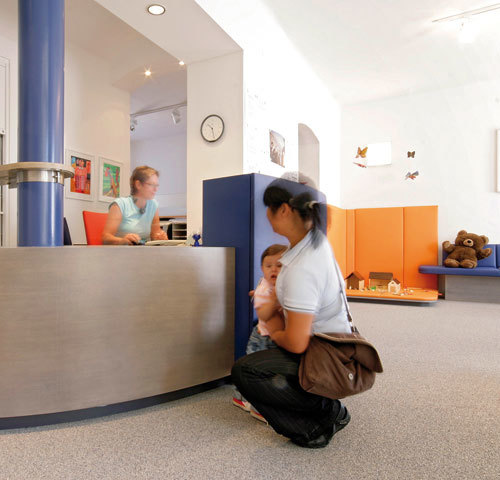 Das geschwungene Möbel im Empfangsbereich mit integrierter EDV–Technik für zwei Arbeitsplätze ermöglicht durch niedrigere und höhere Teile die Kommunikation zwischen Kindern und Erwachsenen auf Augenhöhe. Die Sitzbank (in Form eines großen Ws - „W“ wie Warten?) gliedert den Wartebereich in zwei kommunikative Inseln. Die Garderobe und ein Wickeltisch befinden sich auf der einen Seite des Ws, während auf der anderen der Spielbereich mit einem Kleinkinderpodest unmittelbar anschließt. Der Spielraum hält mit einem Kasperltheater, einem Puppenhaus und dem Kleinkinderpodest eine Menge an Attraktionen parat. All diese Funktionen schälen sich organisch aus der orangen, gepolsterten Plattform und ihrer Rückwand heraus. Man kann nirgendwo anecken, der Raum bietet Geborgenheit und lässt - zumindest theoretisch - die Zeit rascher vergehen. (Text: Gabriele Kaiser)