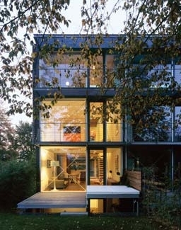Der Architekt Ingo Bucher-Beholz hat schon vor zwanzig Jahren Theo Peters Haus am Starnberger See geplant, damals noch als Mitarbeiter von Schaudt Architekten aus Konstanz. Er ist bekannt für seine filigranen Strukturen in Stahl, Holz und Glas. So entwickelte er auch für den engen Rahmen am Ackermannbogen eine leichte, modulare Architektur, die sich nüchtern und kühl zwischen den alten Baumbestand fügt. In ihrer Klarheit und Rigidität hebt sie sich deutlich von den drei kleinteiligen »Stangen« der anderen Baugruppen in ihrem Rücken ab. Banale Fenster, die das Haus als Wohnhaus lesbar machen und den menschlichen Maßstab herstellen würden, gehen in der Glashaut auf oder werden von dem umlaufenden Schirm aus Alu-Lamellen verhüllt. Ganz im modernen Sinne hat man es hier mit einer »machine for living« zu tun, effizient, abstrakt, minimalistisch maßstabs- oder eben »zeitlos«. Wer weiß schon, wie man in wenigen Jahrzehnten wohnen oder besser: »Wohnen« repräsentieren will?