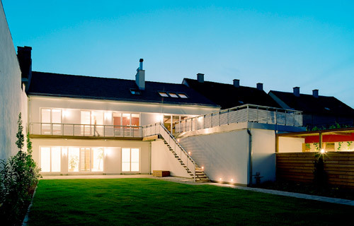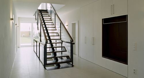 Das Haus wurde in ausgeklügelter Weise mit dem Betrieb verschachtelt, so dass sich für die Bewohner auf der einen Seite eine abgeschlossene Privatheit und auf der anderen Seite ein guter Überblick über das Geschehen im Betrieb ergibt. Während sich das Haus zur Straße hin sehr zurückgenommen in das Erscheinungsbild des Betriebs eingliedert, öffnet sich der Wohnbereich großzügig zum Garten hin. Diese Großzügigkeit setzt sich auch nach innen fort. Schon der Eingangsbereich bietet beim Eintreten eine direkte Sicht in den Garten, wobei man direkt durch die eigens entworfene Treppe blickt.
