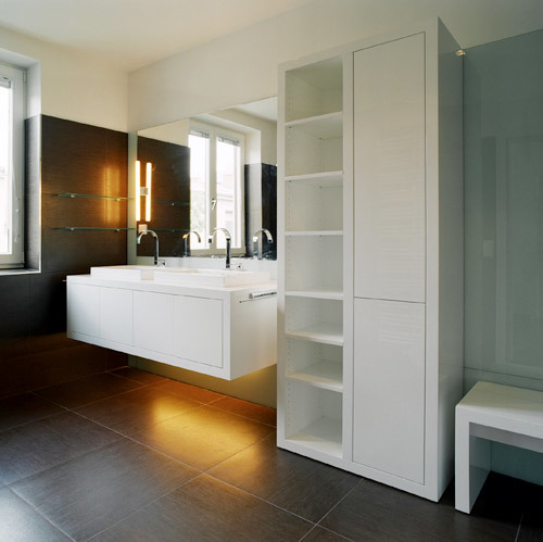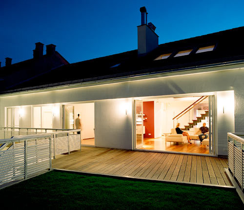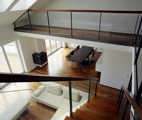 Zentrum des Hauses ist der riesige Wohnraum, in den auch die Küche und der Essbereich eingebunden sind. Dem Prinzip der Offenheit folgen sowohl die komplett zu öffnende Glasfront, als auch die Galerie, die den Raum bis unter das Dach vergrößert. Die Zonierung der einzelnen Bereiche ergibt sich aus den unterschiedlichen Raumhöhen und der Treppe zur Galerie. (Text: Architekten)