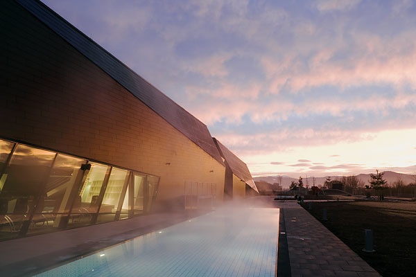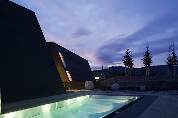 Das unverwechselbare Erscheinungsbild eines freigewaschenen und erodierten Kohleflözes – als Konnex zur Bergbautradition des Ortes – dient als Vorbild für die äußere Gestalt der Therme. Diese Analogie lässt sich in zweifacher Hinsicht ablesen: einerseits als am Gelände situierter Monolith unter Bedachtnahme auf Geländebewegungen und Topografie, gleichsam aus dem Boden gewachsen, andererseits durch die dunkle Außenhaut des Baukörpers.Diese Großform bricht entlang von Achsen auf, die sich auf die direkte und weitere Umgebung beziehen wie Schloss Gabelhofen und umgebende Berglandschaft. Die dadurch entstehenden Einschnitte, gleichsam „Spalten“ im Gestein, ermöglichen eine inszenierte Lichtführung, Spannungen zwischen Innen und Außen in wechselnder Wirkung tagsüber als Belichtung und nachts als Beleuchtung. Der Innenraum kommuniziert mit seiner Umgebung, Öffnungen und Ausblicke werden reduziert, aber ganz bewusst gesetzt.