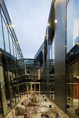 Der Gebäudekomplex gruppiert sich um einen Innenhof, der Licht und Grün in den Innenraum bringt. Nach dem Betreten der Therme öffnet sich der erste Blick auf dieses begrünte Atrium, das tagsüber durch die Sonneneinstrahlung und nachts durch Beleuchtung ein Spiel mit Licht und Schatten zulässt und die Jahreszeiten im Inneren der Therme erlebbar macht. Dieses Atrium liegt entlang einer Belichtungsachse, die mit einem Glasdach versehen ist. (Text: Architekten)