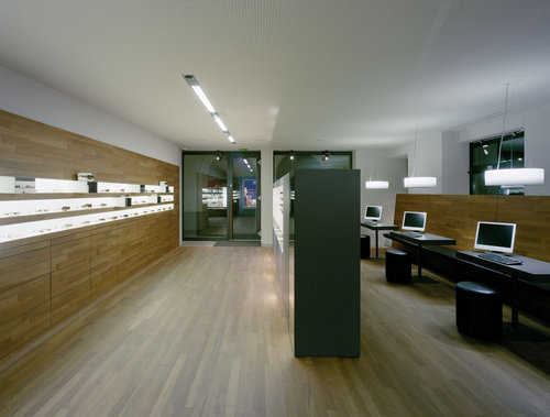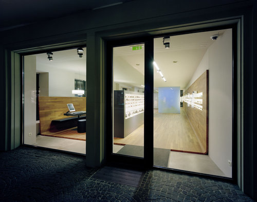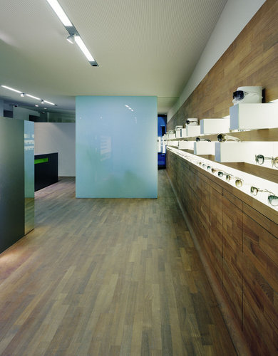 Signifikant und reduziert ist der Materialeinsatz: Die „Schale“ aus Teak vereint Wandflächen mit Boden, fließt in die Raumtiefe. Darauf ist das schwarze Einzelmöbel positioniert. Die optischen Gerätschaften sind hinter der beleuchteten Glaswand getarnt, welche die Decke berührt und durch das verspiegelte Zwischenband ein reizvolles Spiel mit der Schauwand eingeht. (Text: Martina Pfeifer-Steiner)