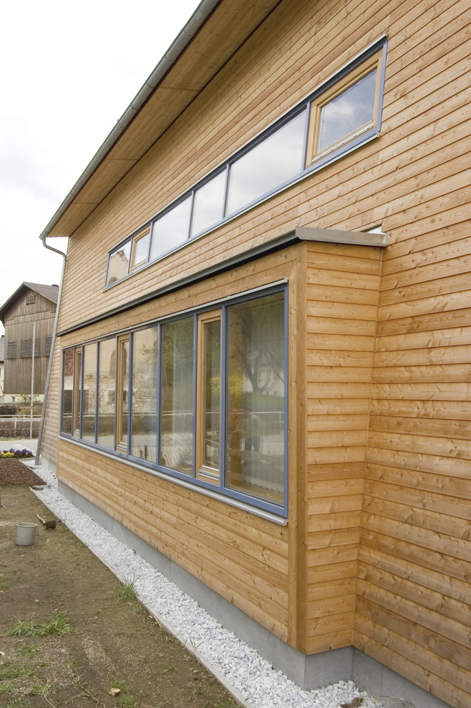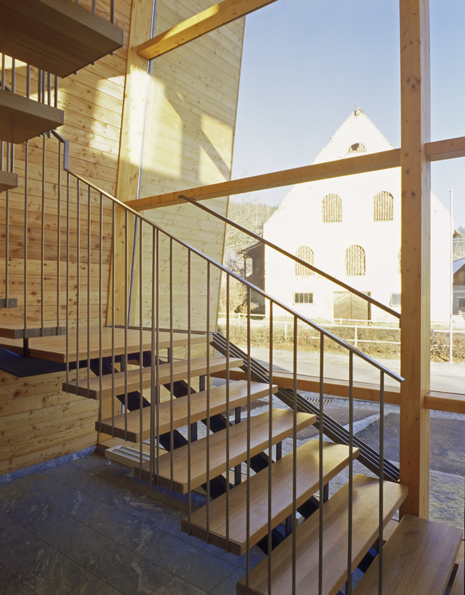 Die Eingangszone des Gemeindeamtes ist als Kopf des Gebäudes mit schützendem Vordach ausgebildet, Gemeindeamt und Rüsthaus teilen sich in einem kompakt konzipierten Gebäude den Sitzungs- bzw. Schulungsraum. Die klare Gestaltung des Baukörpers und die feine Ausführung der Fassade - Lärchenschalung und Glaselemente - heben das „kommunale Gebäude“ trotz seines bescheidenen Bauvolumens von den umgebenden mächtigen Wirtschaftsgebäuden ab. Das in Holzbauweise errichtete Gebäude bietet ein vielfältiges, licht durchflutetes Raumgefüge; der Wechsel von verschieden proportionierten Räumen und die unterschiedliche Lichtführung erzeugen Spannung: auf hohe Räume folgen tiefe, lang gezogene Räume, direktes, indirektes und Licht von oben wechseln je nach Raumfunktion.
