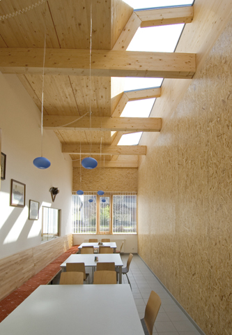 Die Holzkonstruktion wird auch in der Innenraumgestaltung erlebbar: Zwei Leimholzträger überspannen die Fahrzeughalle, diese Träger sind mit der Pfettenlage der Dachkonstruktion verbunden und zu Glasoberlichten, welche die Raumtiefe erhellen, ausgebildet.