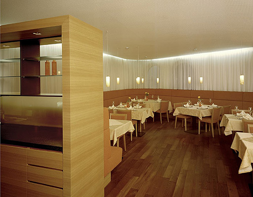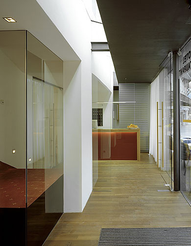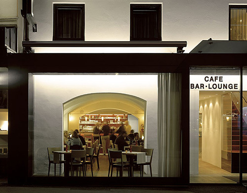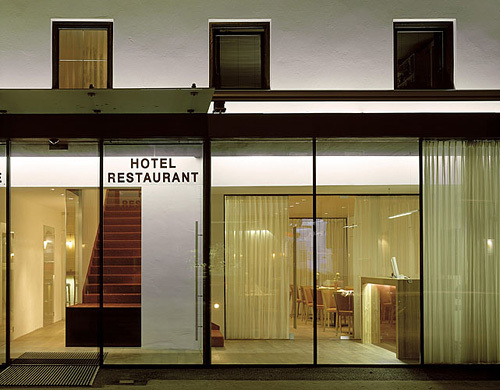 Der neue Körper berührt den Altbestand nur in Form eines schmalen Glasschlitzes. Dadurch werden die ursprünglichen Gebäudekonturen wieder wahrnehmbar und die räumlich erweiterten Bereiche des Cafés, der Rezeption und des Foyers zusätzlich mit Tageslicht versorgt. Die Holzfassade, die sich von der Südseite bis ans Ende der Ostseite erstreckt, verstärkt die dynamische Form des Zubaus. Der bestehende Abgang zum Club an der Ostseite des Gebäudes wird in das Gestaltungskonzept miteingebunden und erhält dementsprechend eine räumlich und gestalterisch aufgewertete Präsenz. (Text: Architekten)