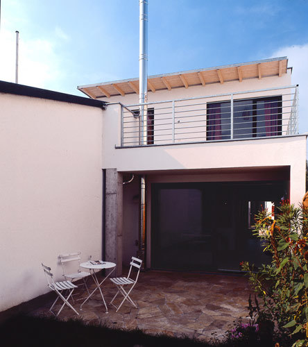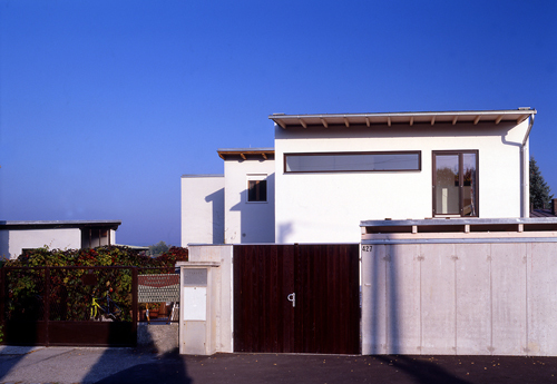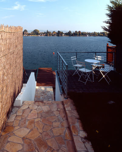 Im Hausinneren sorgt ein Luftraum im Erschließungsbereich trotz der kompakten Raumfigur für Großzügigkeit. Das in Massivbauweise errichtete Gebäude ist Ost-West orientiert und in zentraler Stelle auf dem Grundstück positioniert, sodass sich unterschiedlich nutzbare Außenräume ergaben. Von der dem See zugewandten Gartenseite gelangt man über Treppen hinunter zum Wasser mit Badesteg, Geräteschuppen und Bootsanlegeplatz. Im Obergeschoss des Hauses sind die Schlafräume untergebracht, hier bietet sich von der Terrasse das sich nie verbrauchende Erwartbare – die freie Sicht auf den See. (Text: Gabriele Kaiser)