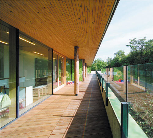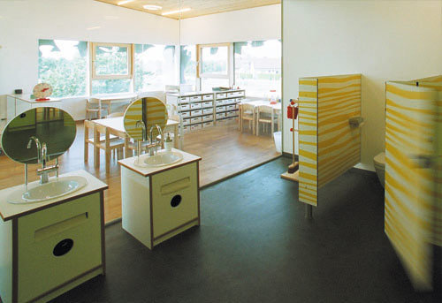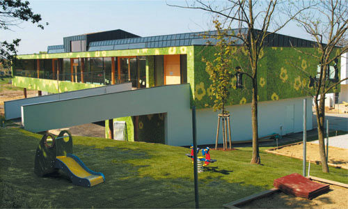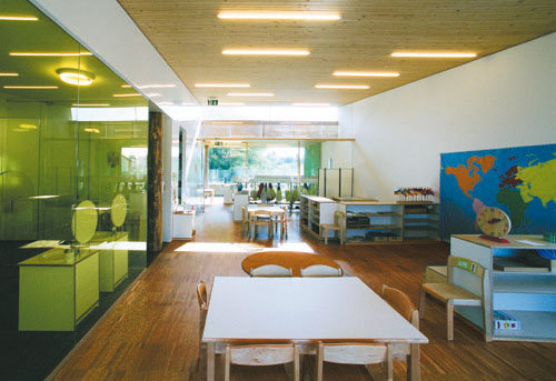 Da besonders bei Kindern eine gesunde Raumökologie wichtig ist, wurde bei der Planung großer Wert auf die Nachhaltigkeit der Materialien sowie deren ökologisch einwandfreie Verarbeitung gelegt. Aus diesem Grund ist das Gebäude größtenteils in Holzbauweise errichtet und zeigt dies auch im Innenraum. Das Sockelgeschoss ist als Ziegelbau mit massiven Baumstämmen als Stützen ausgeführt auf der die aussteifende Stahlbetondecke über dem EG aufliegt. Das Obergeschoss mit den Gruppenräumen ist mit Holzriegelwänden und einer vorgehängten Holzschichtstoffplatten-Fassade ausgeführt, in der vor den Fenstern ein Figurenband ausgeschnitten ist. Über der massiven, naturbelassenen Brettstapeldecke ist das flach geneigte Dach als extensiv begrünte Dachkonstruktion aufgesetzt. Entsprechend der Nutzung sind die „allgemeinen“ Räume mit einer monolithischen Betonplatte, die Gruppen- und der Bewegungsraum mit einem Hochkantlamellenparkett ausgestattet. Die Einrichtung und Möblierung haben eine neutrale weiße Oberfläche mit unterschiedlichen haptischen Qualitäten. (Text: Architekten)
